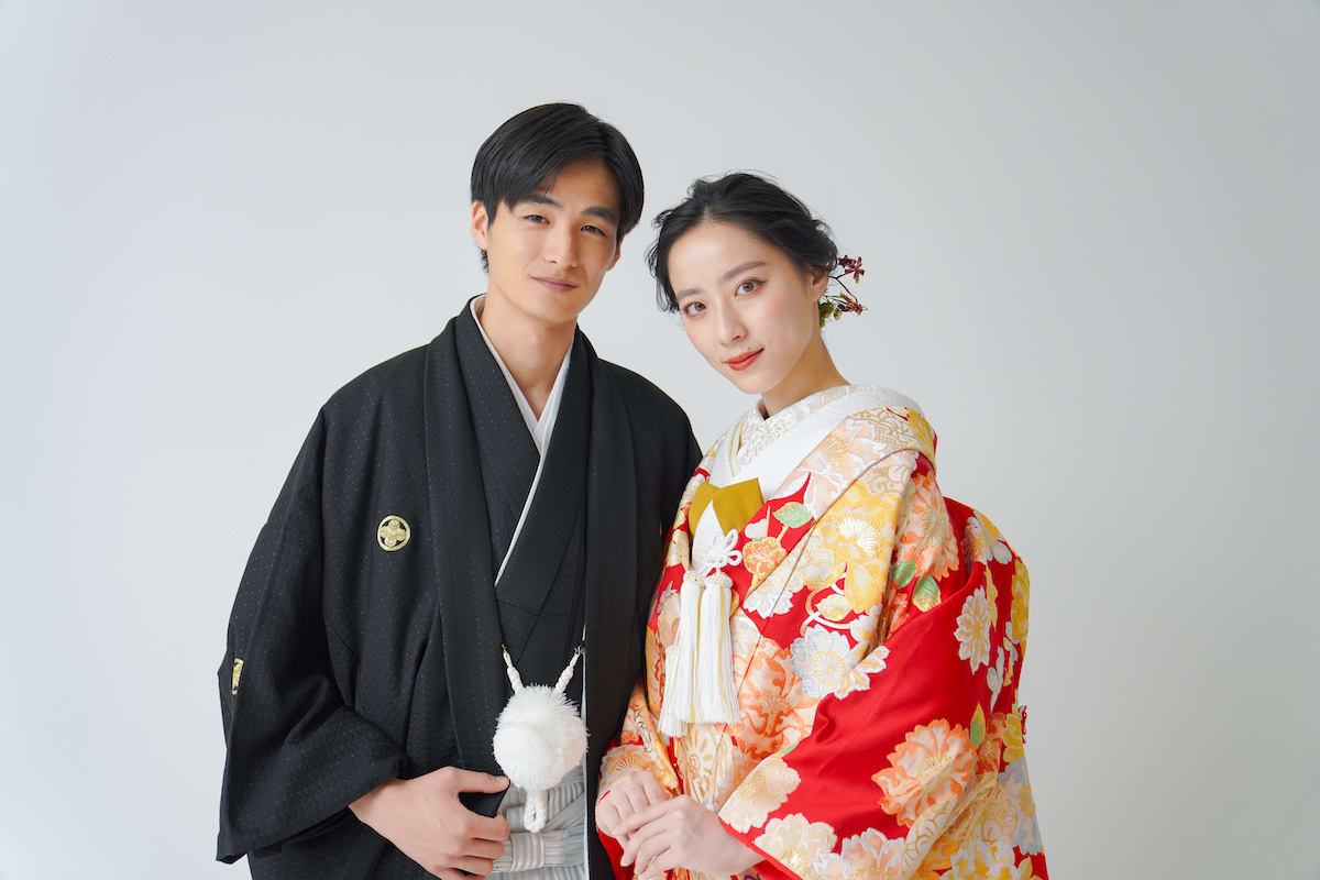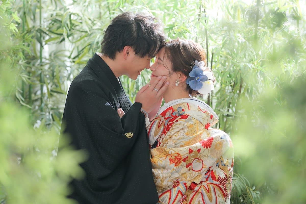 和装姿を定番ショットもしっかり残すスタジオ撮影。シンプル背景から和を極めた茶室、お花に彩られた壁までいろいろと選べます。