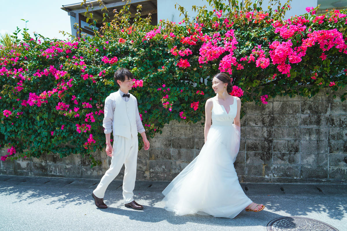エメラルドグリーンの海と白い砂浜、青い空の下で撮るビーチフォト。沖縄らしい緑の中や文化を感じられるスポットでの撮影も叶います。